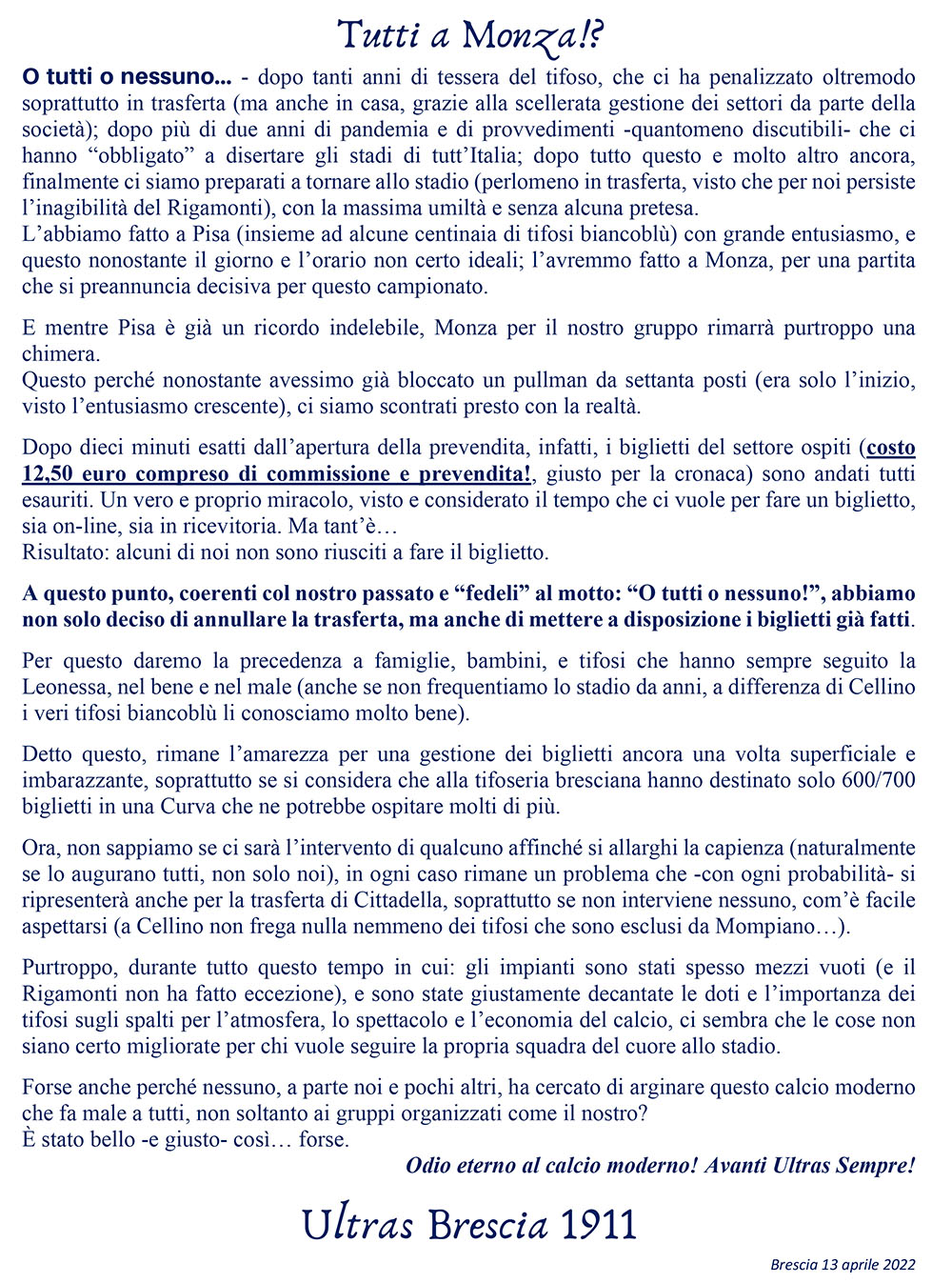 O tutti o nessuno… – dopo tanti anni di tessera del tifoso, che ci ha penalizzato oltremodo soprattutto in trasferta (ma anche in casa, grazie alla scellerata gestione dei settori da parte della società); dopo più di due anni di pandemia e di provvedimenti -quantomeno discutibili- che ci hanno “obbligato” a disertare gli stadi di tutt’Italia; dopo tutto questo e molto altro ancora, finalmente ci siamo preparati a tornare allo stadio (perlomeno in trasferta, visto che per noi persiste l’inagibilità del Rigamonti), con la massima umiltà e senza alcuna pretesa.