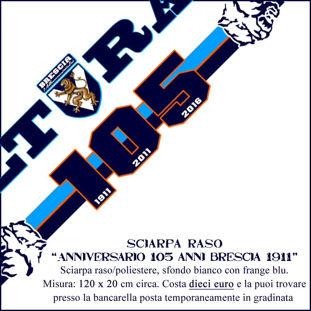 24/01/2016 | Categorie: News | Tags: 105, Anniversario centocinque anni, Bancarella, brescia 1911, Materiale, poliestere, Sciarpa, Sciarpa raso, Scudo Leonessa, Stampa, stampa fronte retro, Testa Leonesse, ultras | Lascia un commento