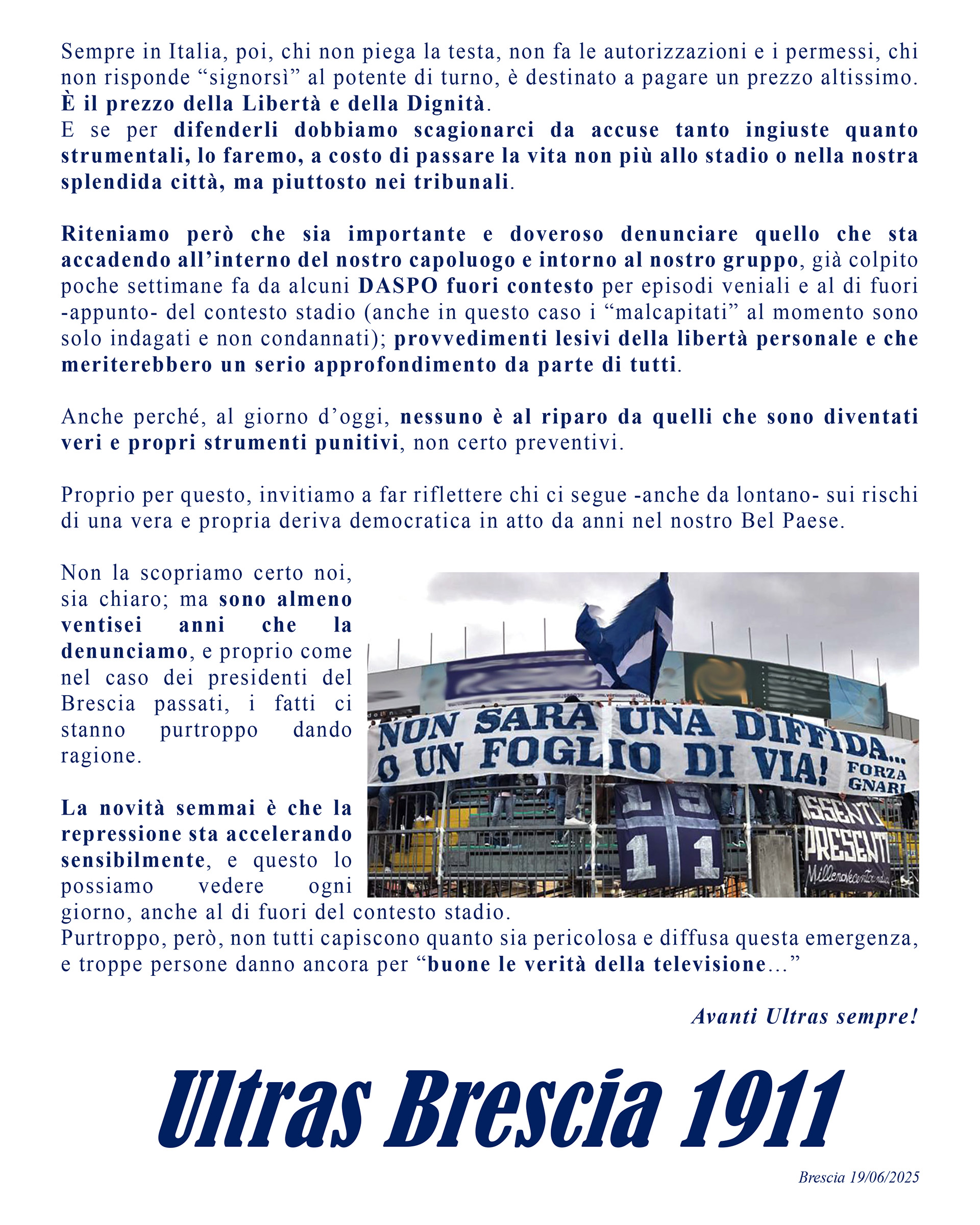 Riteniamo perรฒ che sia importante e doveroso denunciare quello che sta accadendo allโinterno del nostro capoluogo e intorno al nostro gruppo, giร colpito poche settimane fa da alcuni DASPO fuori contesto per episodi veniali e al di fuori -appunto- del contesto stadio (anche in questo caso i โmalcapitatiโ al momento sono solo indagati e non condannati); provvedimenti lesivi della libertร personale e che meriterebbero un serio approfondimento da parte di tutti.
